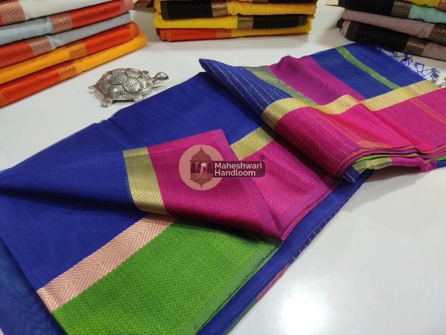 Maheshwari Blue Ganga Jamuna Border Sarees with contrast and running Blouse-Pallu