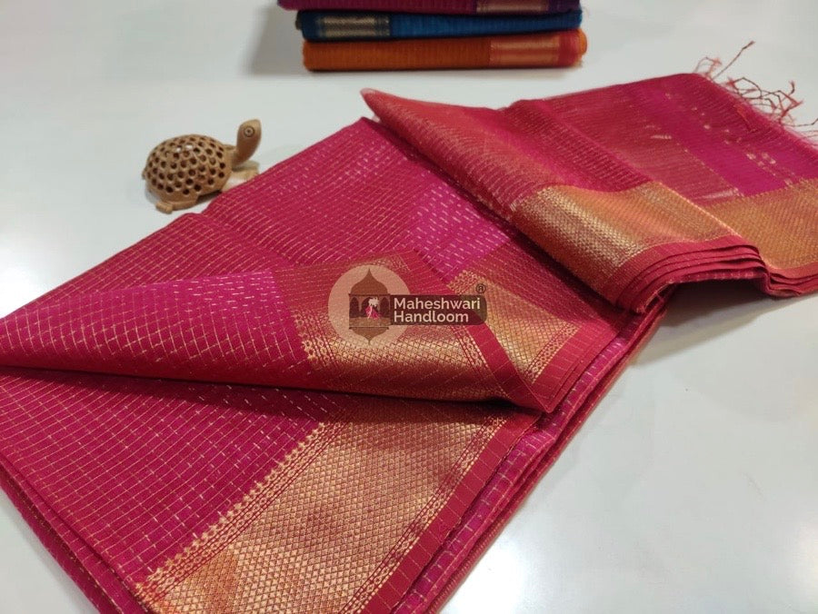 Maheshwari Rani Pink Zari-Checkered Body Sarees with contrast and running Blouse-Pallu