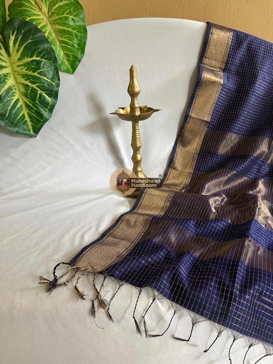 Maheshwari Blue Zari-Checkered Body Sarees with contrast and running Blouse-Pallu