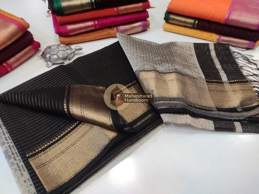 Maheshwari Black Self Zari Lining Body Sarees with contrast and running Blouse-Pallu