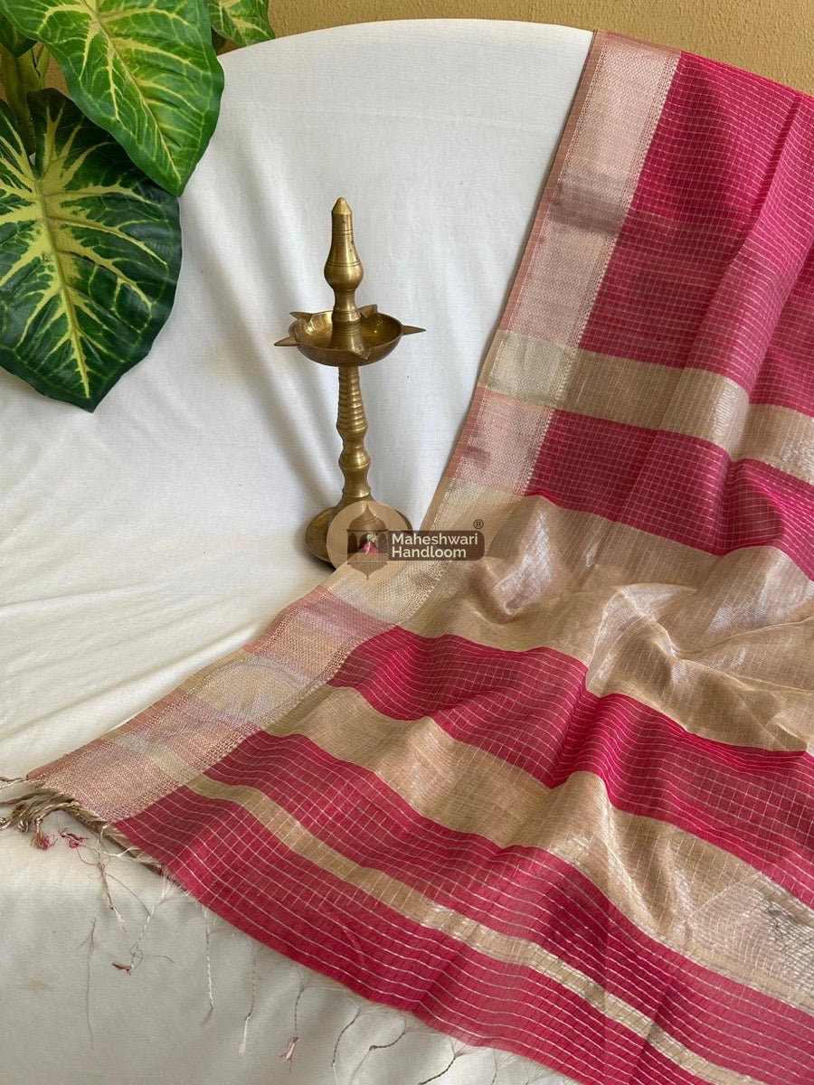 Maheshwari Fuchsia Pink Silver Zari Checks Silk Saree