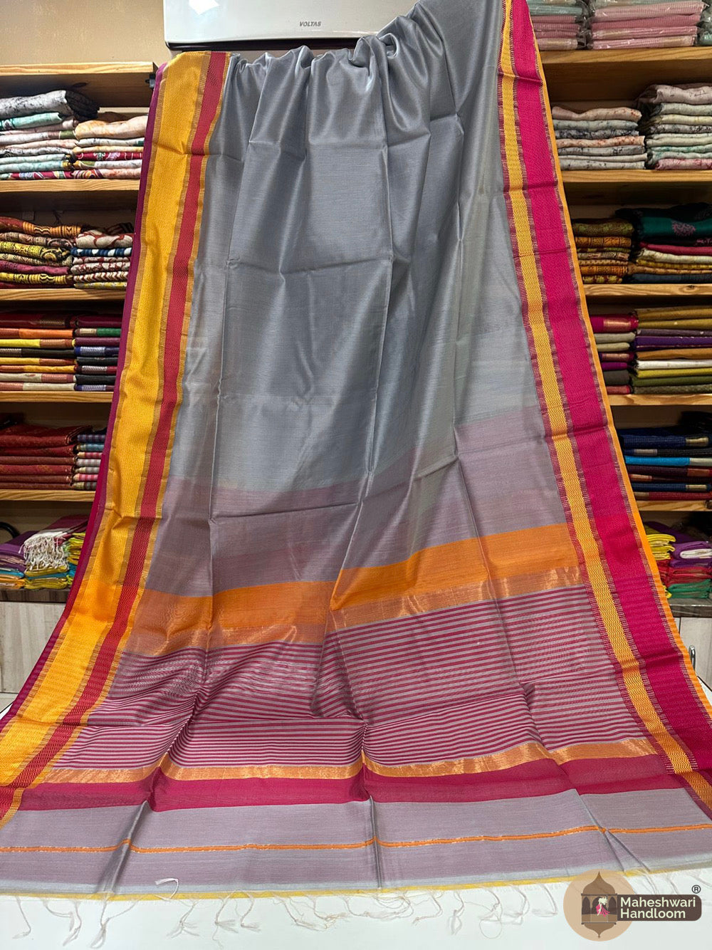 Maheshwari Ganga Jamuna Border SareesWeaving:Fabric: Silk Cotton.Length: 6.2 meters.Blouse: With Blouse 70-80 cm.Washing method: Dry Clean Recommended.Origin: Maheshwar, Madhya Pradesh.
