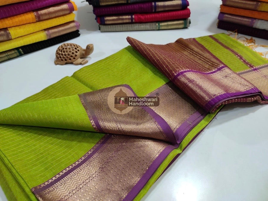 Maheshwari Parrot Green Self Zari Lining Body Sarees with contrast and running Blouse-Pallu