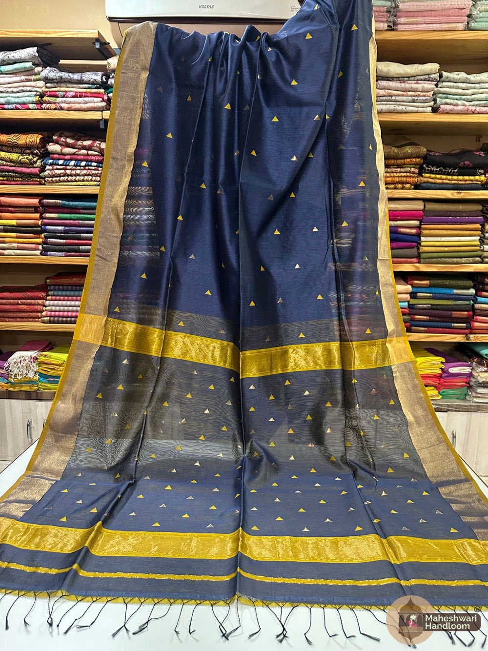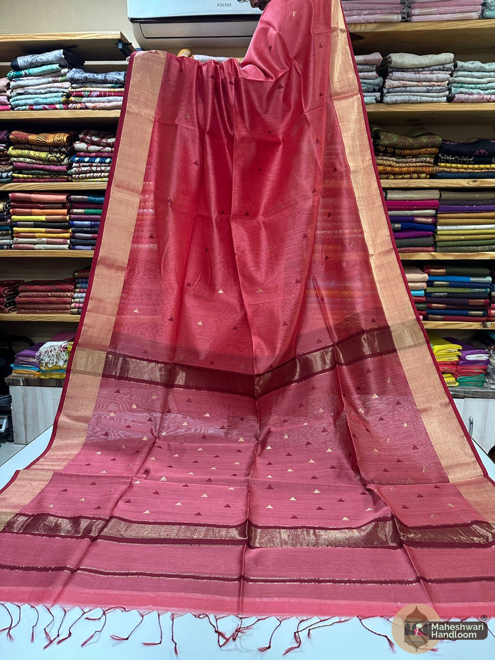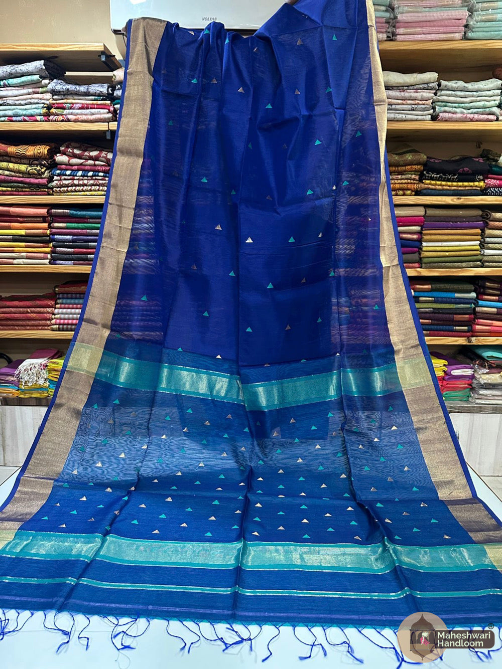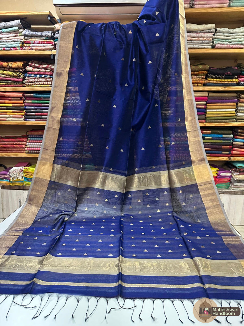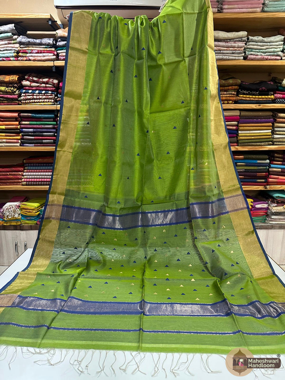 Maheshwari Triangle Zari Butti SareesWeaving:Fabric: Silk Cotton.Length: 6.2 meters.Blouse: With Blouse 70-80 cm.Washing method: Dry Clean Recommended.Origin: Maheshwar, Madhya Pradesh.