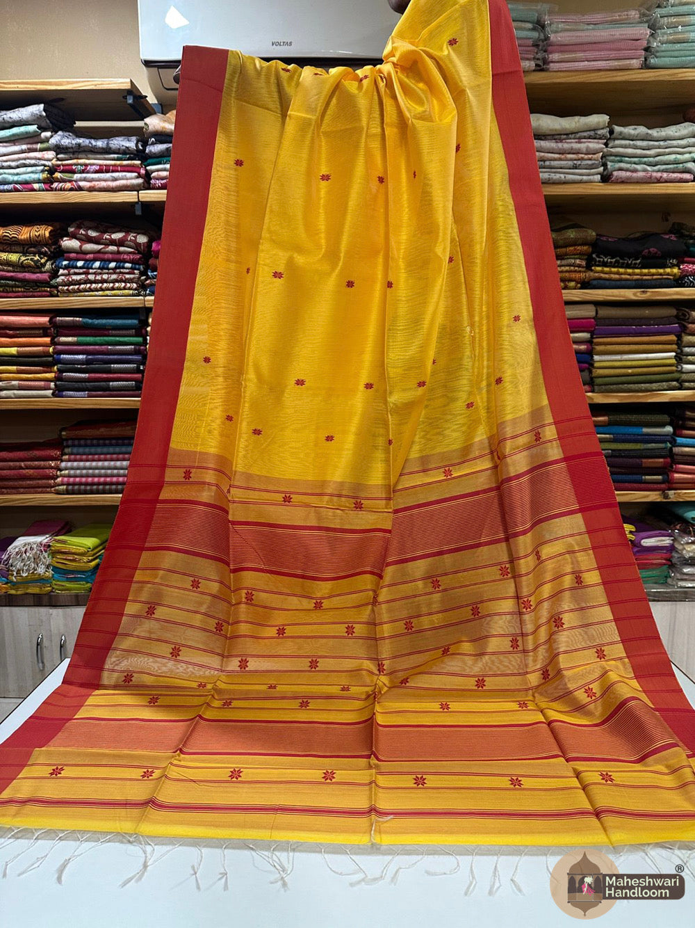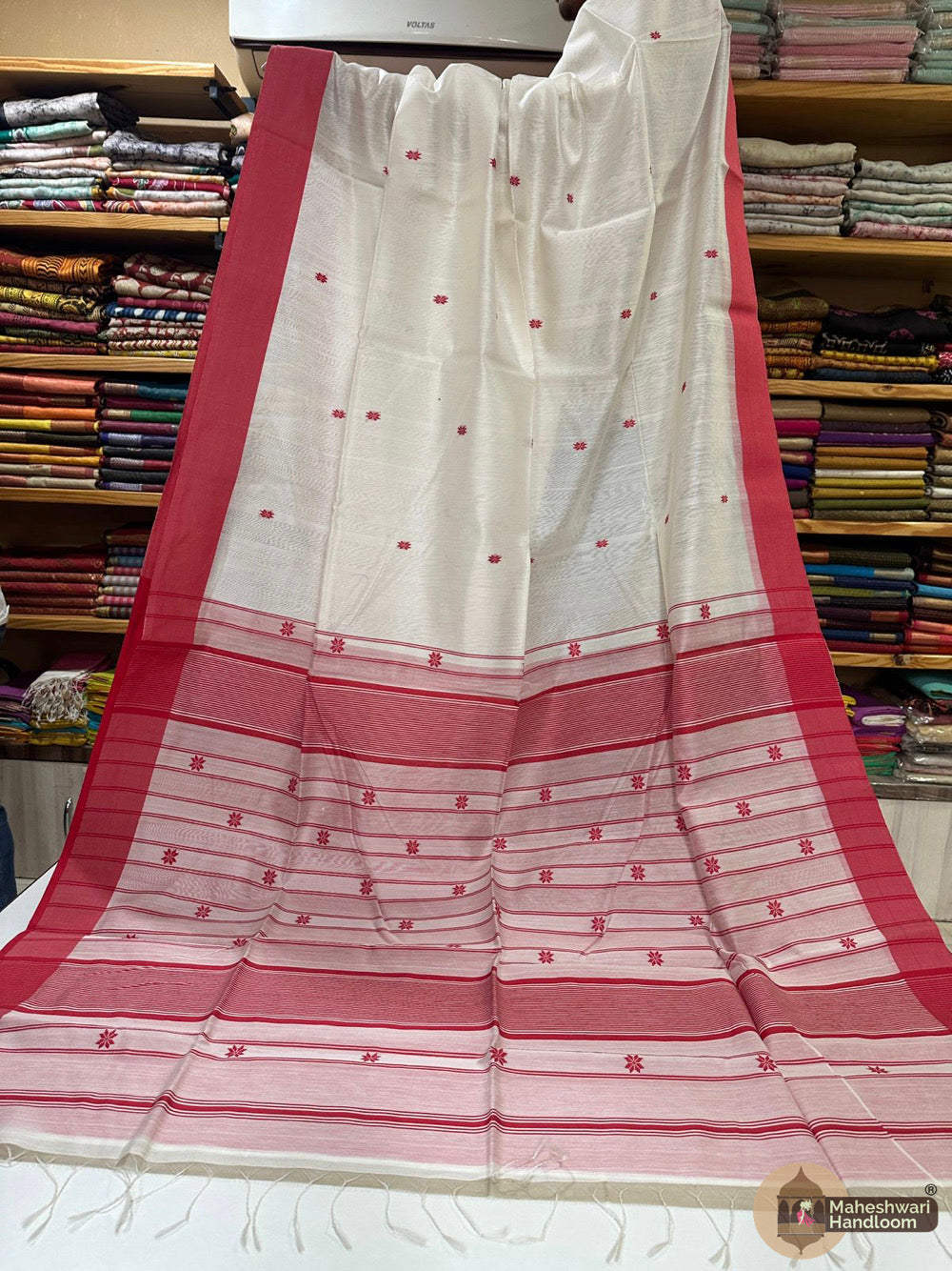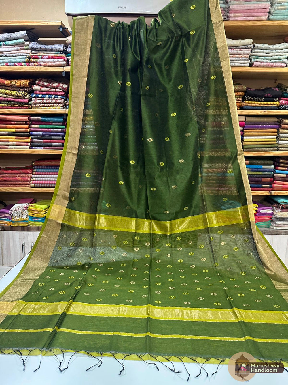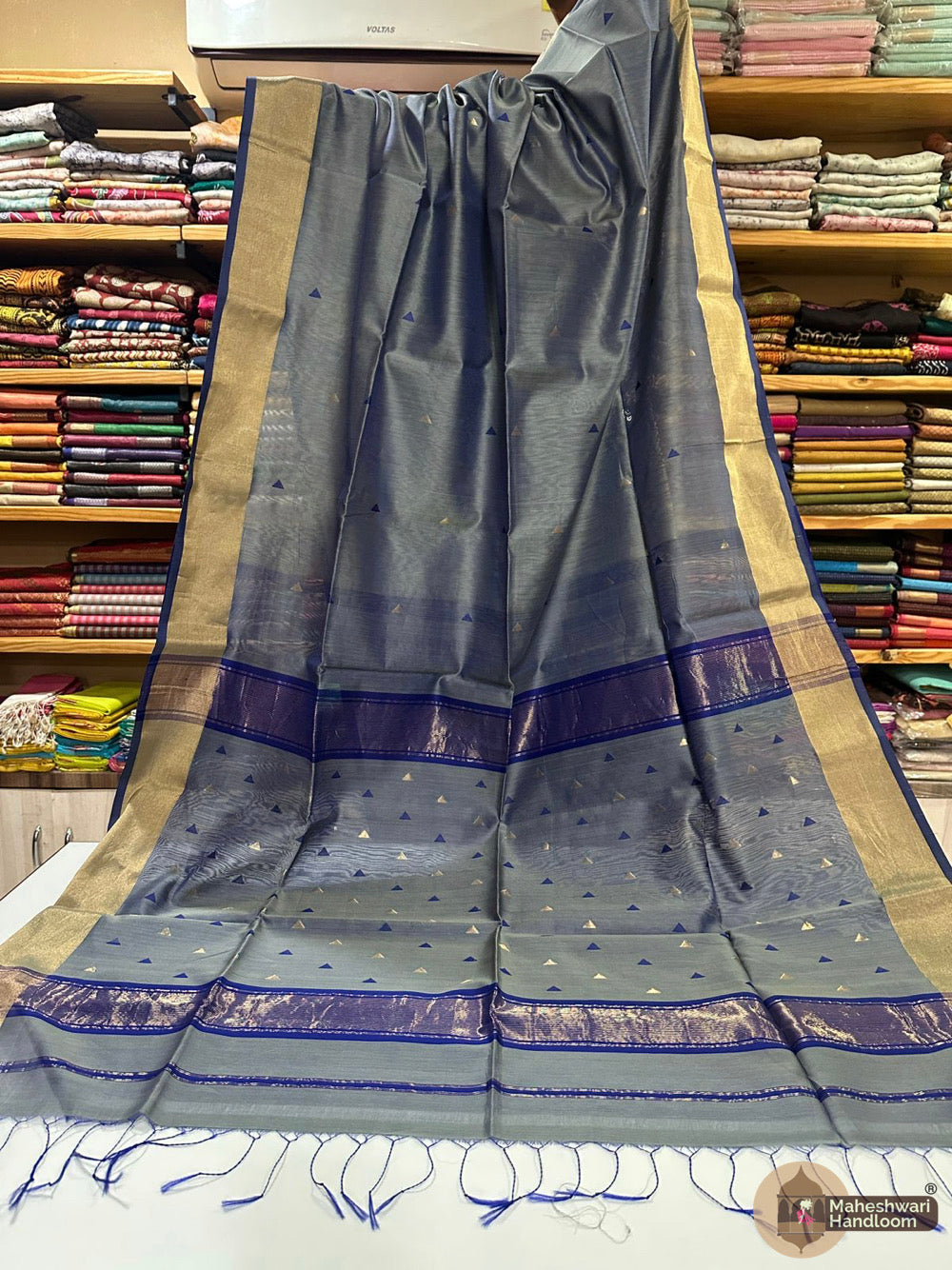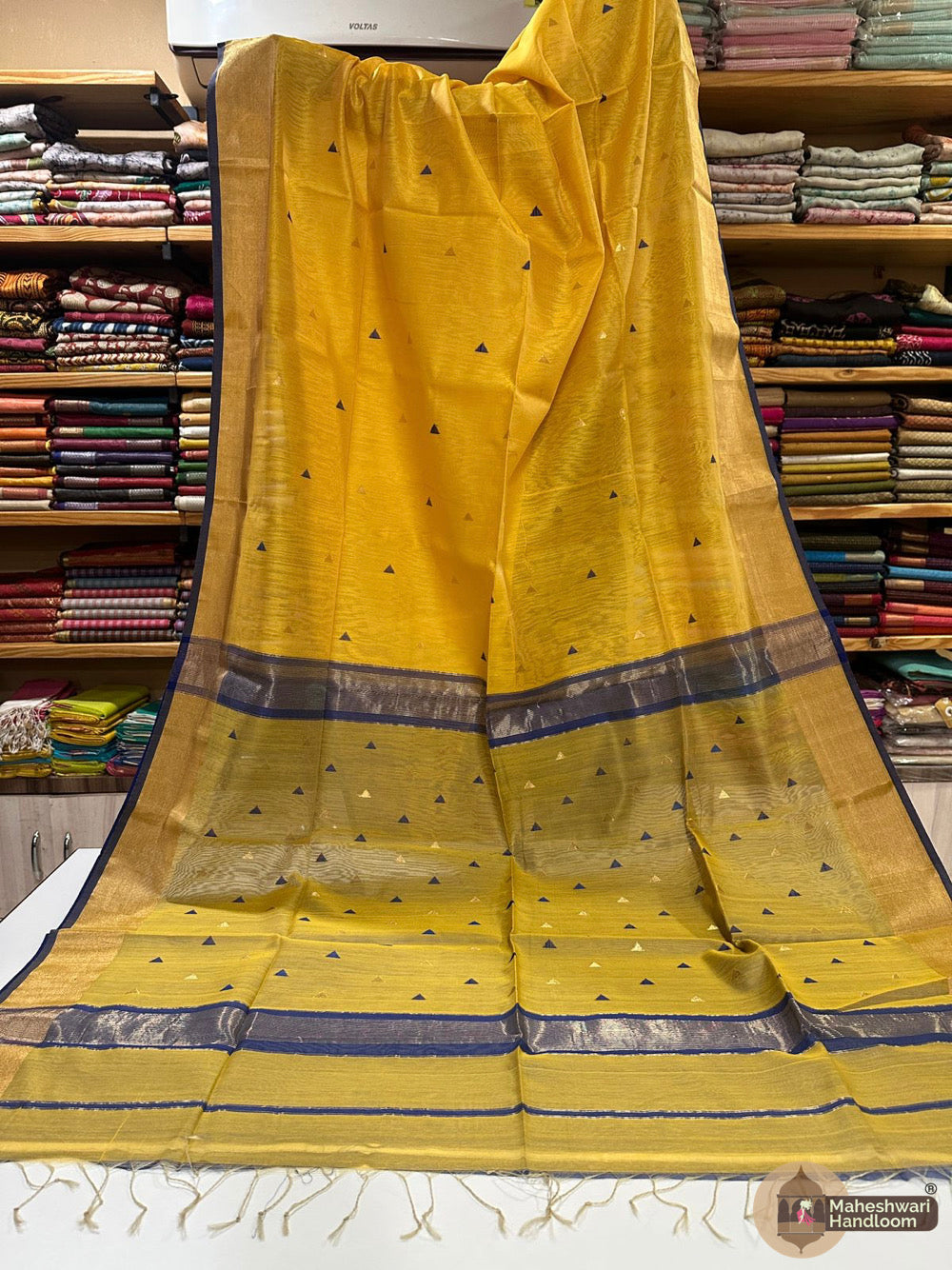 Maheshwari Triangle Zari Butti SareesWeaving:Fabric: Silk Cotton.Length: 6.2 meters.Blouse: With Blouse 70-80 cm.Washing method: Dry Clean Recommended.Origin: Maheshwar, Madhya Pradesh.
