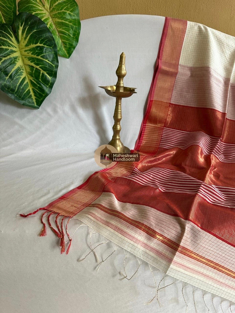 Maheshwari White Zari-Checkered Body Sarees with contrast and running Blouse-Pallu
