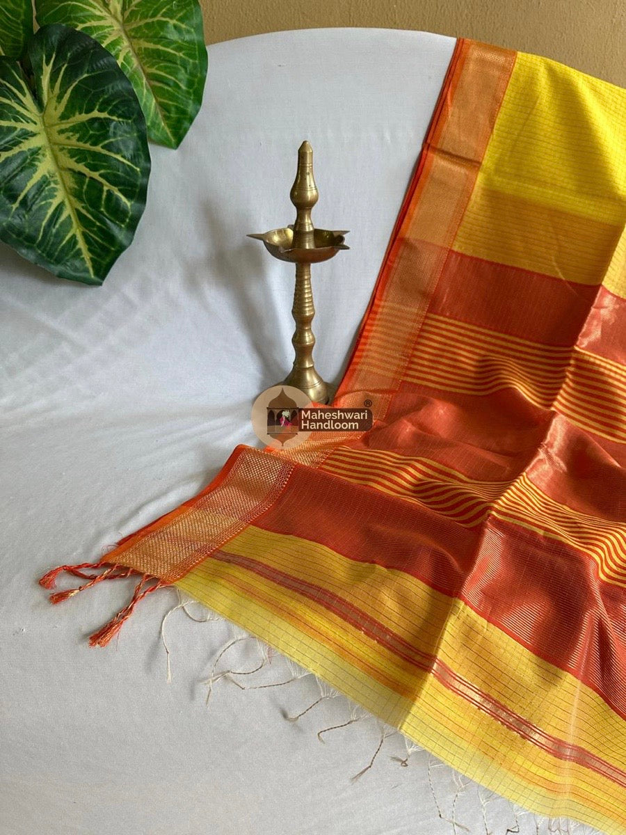 Maheshwari Yellow Zari-Checkered Body Sarees with contrast and running Blouse-Pallu